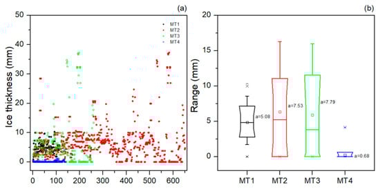 The icing thicknesses are separately counted for the four distinct micro-terrains during the icing process. The data consider only instances where icing was observed during the icing process, and days without ice accretion were excluded from the analysis. For MT1, this icing process has 110 records at all stations (Figure 3a). The icing thicknesses of different stations are mainly in the range of 2.50–7.50 mm, with an average thickness of 5.08 mm (Figure 3b). For MT2, there are 549 records of icing at all stations. The icing thicknesses are concentrated in the range of 0–10 mm, with an average icing thickness of 7.53 mm. For MT3, 201 records of icing can be found. Similar to MT2, the icing thicknesses also fall in the range of 0–10 mm, with an average thickness of 7.79 mm. In contrast, in terms of MT4, only 48 icing records are found at all stations, and the icing thickness is almost 0, with an average of only 0.68 mm. This result highlights notable differences in icing thickness on overhead transmission lines under different micro-terrains. For the three types of micro-terrain conducive to water vapor concentration, icing tends to be thicker. However, on flat terrain, it is difficult for water vapor to accumulate, and there is almost no icing.