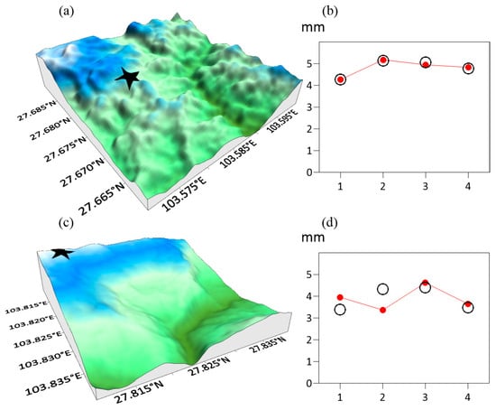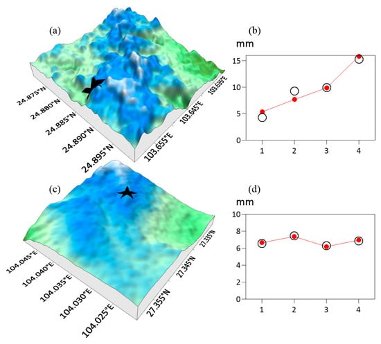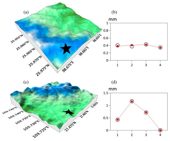 In this section, we further analyze the observed and simulated icing thickness at different observation stations in the typical micro-terrains (Figure 4, Figure 5, Figure 6 and Figure 7). In Figure 4a, the observation station (103.580° E, 27.678° N) represents MT1, situated on the mid-slope of the “uplifting type”. Its terrain is conducive to the uplift and condensation of water vapor. Therefore, overhead transmission line icing occurred, with observed icing thicknesses of 4.2689 mm, 5.1248 mm, 5.0498 mm and 4.7804 mm during the four days of this icing process (Figure 4b). The icing thickness simulations were 4.2670 mm, 5.1789 mm, 4.9474 mm and 4.8306 mm on these days, close to the observations, with an average deviation of only 0.0522 mm relative to the observations. The other observation station (103.811° E, 27.814° N), as shown in Figure 4c, is located at the top of the slope. The observations indicate that the icing thickness at this station is about 4 mm, as depicted in Figure 4d. The detailed icing thicknesses during the four days of this icing process were 3.3930 mm, 4.3195 mm, 4.4043 mm and 3.4724 mm. The simulated icing thicknesses were 3.9552 mm, 3.3680 mm, 4.6206 mm and 3.6453 mm, with an average deviation of 0.4757 mm relative to the observations.