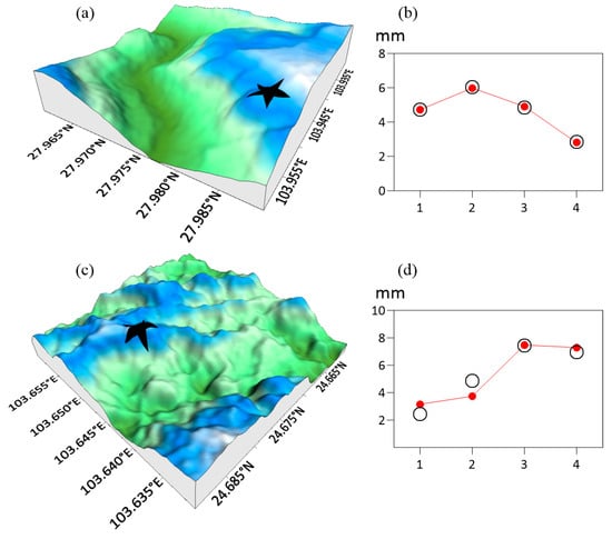 Microtopography “high mountain watershed type” in two different locations (a,c), with the pentagram representing the specific position of the observation point in the microtopography. Observed (black circle) and simulation (red solid line) ice cover thickness of the observation point (b,d).