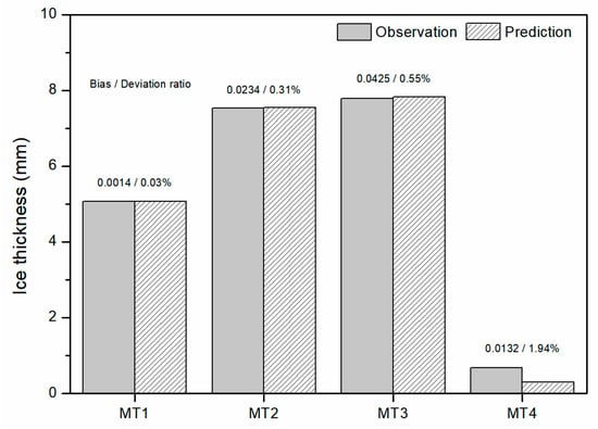 The simulations and observations of icing thicknesses under four different terrain conditions are counted to analyze the simulation performance of the technique proposed in this study, as presented in Figure 8. The observed and simulated icing thicknesses were 5.0754 mm and 5.0740 mm in MT1, 7.5324 mm and 7.5558 mm in MT2, and 7.7936 mm and 7.8361 mm in MT3, respectively. The simulation deviations are 0.0015 mm, 0.0235 mm and 0.0425 mm, and the deviation ratios are 0.03%, 0.31% and 0.55%. For MT4, the observed mean icing thickness was 0.6812 mm, and the simulated icing thickness was 0.6680 mm, with an absolute deviation 0.0131mm and a deviation ratio 1.94%.