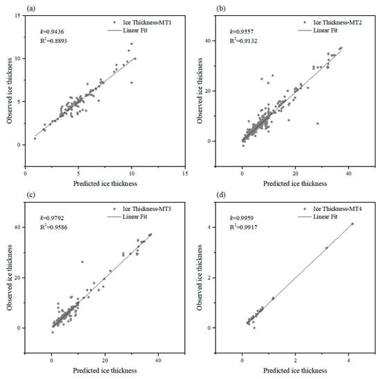 Correlation between observation and simulation of ice thickness under different terrains. (a) MT1, (b) MT2, (c) MT3, (d) MT4.