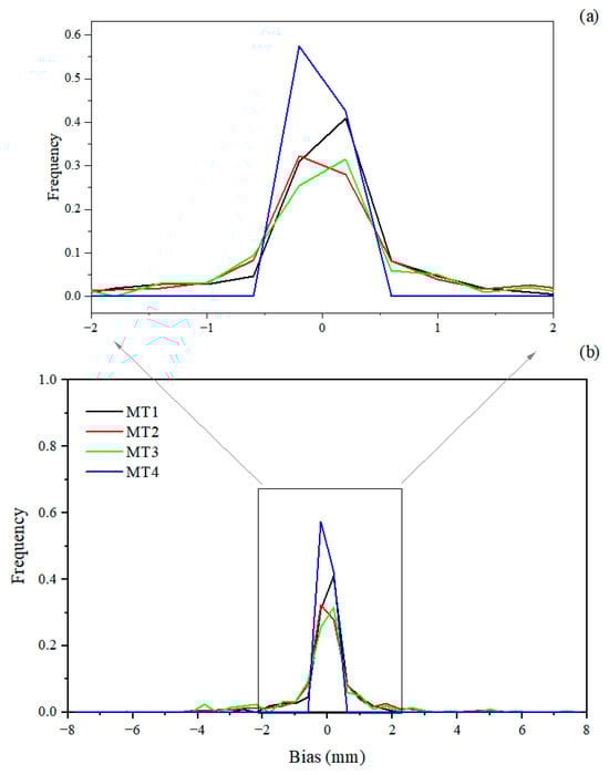 For the correlation between observations and simulations of icing thickness (Figure 9), the correlation coefficient is the highest in MT4, 0.9959 (with a goodness of fit reaching 0.9917). The second highest correlation coefficient is for MT3, 0.9792 (with a goodness of fit up to 0.9586). The correlation coefficients for MT2 and MT1 are 0.9557 and 0.9436, respectively, with a goodness of fit of 0.9132 and 0.8893, respectively. The correlation between the simulations and observations of icing thickness is high for these four types of terrain, and it is significant at the 0.99 confidence level. This result suggests that the icing thickness simulation method used in this study can effectively reproduce the actual observations. Furthermore, the deviation distribution of the icing thickness simulations for different micro-terrains (Figure 10) indicates that the deviations of icing thickness simulations are symmetrically distributed around 0.0 mm, and they are mainly in the range of ±0.5 mm. Among them, the simulation deviations are the most concentrated in MT4 (with the largest probability), followed by MT1. The deviation distributions of icing thickness simulations in MT2 and MT3 are nearly the same.