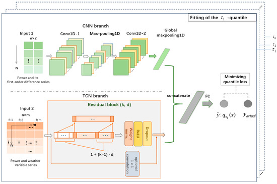 Finally, the output feature maps of the above two branches are concatenated into one long vector using the concatenation operation, which is used as the input to the last fully connected (FC) layer. The FC layer utilizes the same number of neurons as the number of quantiles to be predicted to output the forecast results of different quantiles. The output of the whole model can be expressed as