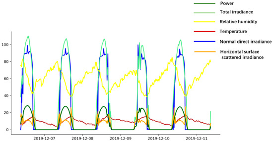 For deep learning models, more features as input are not better. Too many features may lead to data redundancy, which can affect the forecasting performance of the model. Therefore, this study explores the input feature combinations through experimental trial-and-error methods [27] and finally chooses daytime data of six features—total irradiance, normal direct irradiance, horizontal scattered irradiance, humidity, and temperature—as the final input feature data. Detailed statistics of the data from the three PV plants are shown in Table 1. As an example, Figure 4 shows the trends of these variables with respect to power for five consecutive days (all irradiance values are scaled down by a factor of 10 for clarity and intuition) on dataset 1, from which a clear correlation can be seen between the trends of these weather variables with respect to power.