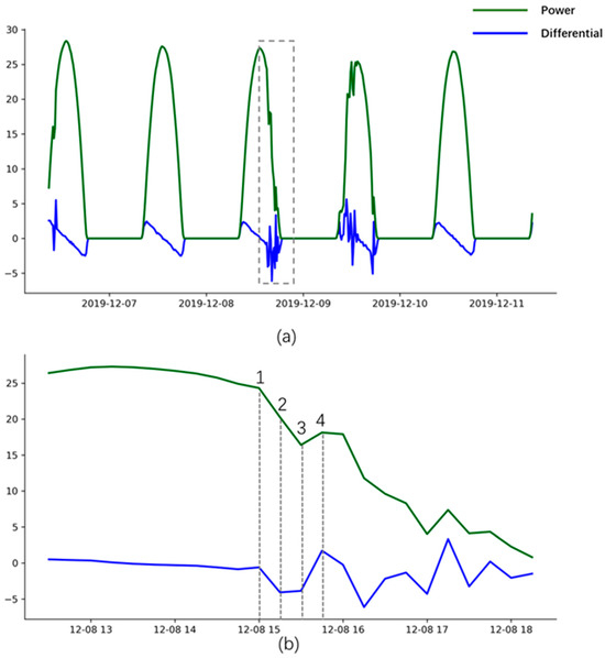 Trend comparison of the PV power series with its first-order difference series. (a) PV power series for five consecutive days with its first-order difference series. (b) Enlarged view of the dotted box in (a).