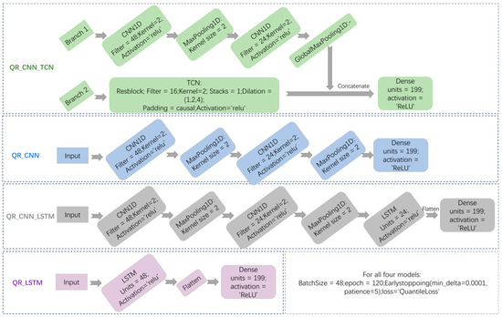 In this paper, three sets of experimental tasks are executed: (1) Point-forecasting experiments. (2) Interval-forecasting experiments. (3) Probabilistic-forecasting experiments. In order to validate the comprehensive performance of the proposed models, we select LSTM, CNN, and CNN_LSTM [34] combined with QR, which are deep learning models with excellent forecasting performance in the domain, as the benchmark comparison models. The framework and parameter settings of the models involved in this paper are shown in Figure 6. All parameters are set by trial and error [28].