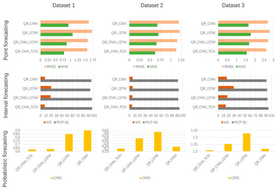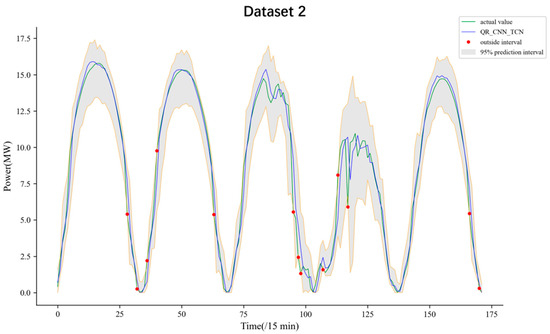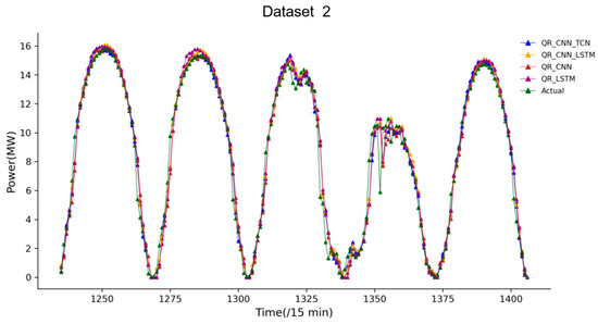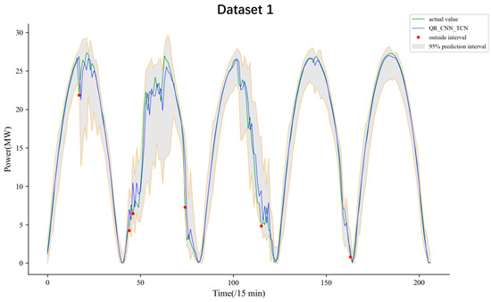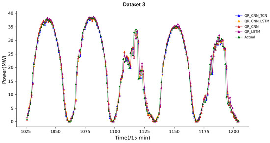 (3) In order to verify the comprehensive performance and applicability of the proposed models for point forecasting, baseline model comparison experiments were conducted on three different datasets. The forecasting results of all models on three different datasets are given in Table 4. Compared to other commonly used and state-of-the-art DL models in the field, the proposed method in this study exhibits better point-forecasting results on all three datasets. This also indicates that the proposed models have better applicability. On dataset 1, the proposed model shows more advantages, with a 9.8% boost in MAE and a 1% boost in RMSE compared to the best-performing QR_CNN_LSTM model among the other models. On dataset 2, the MAE boosts 5.3% and RMSE boosts 2% compared to the best-performing QR_CNN_LSTM model among the other models. On dataset 3, the MAE boosts 6.1% and RMSE boosts 3.2% compared to the best-performing QR_CNN model among the other models. In addition, all models obtained high on the three different datasets, indicating that all models are able to capture most of the patterns and relationships in the data. Compared to the other two datasets, on dataset 1, all models exhibit the optimal , 0.97.