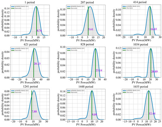 In this study, we post-process the discrete quantile forecast results using a KDE method incorporating 5-fold cross-validation in order to obtain a more continuous and smooth probability density distribution. This helps power system decision makers to use continuous probabilistic information in their decisions, which is important for downstream applications such as energy management and scheduling. As an example, Figure 14 shows the probability density curves of the proposed model on dataset 1 at 9 sampling points (sampling the test set in 8 equal parts). As can be seen in the results, the overall shapes of these curves are basically similar, with relatively full contours. And their widths and heights are also moderate, indicating that the probability density curves obtained using the KDE method combined with cross-validation are valid. At time periods 828, 1034, 1448, and 1655 in the test set, the observation point is located at the center of the probability density curve. The observations are very close to the center of the probability density curve at time periods 1, 414, and 621. This indicates that the model’s forecasting accuracy is very high for all of these time periods. At time periods 207 and 1241, the observations are off the center of the probability density curve. This indicates that the model’s forecast error is high in these time periods. Overall, the forecast results are reliable for most of the time periods and can be used to assist power system decision makers in making decisions. In addition, there is a degree of long tailing around the 0 value on the left side of each of these curves, indicating that the model is relatively conservative in its forecasts for the lower quantiles. This is consistent with the interval-forecasting results.