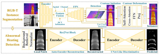 (1) Existing methods commonly use object detection to extract target boxes and analyze the temperature within boxes areas [8,9]. However, due to the complex environments and dense equipment within transformer substations, the temperature of background objects may affect the temperature discrimination of foreground equipment. Moreover, due to the inherent low resolution and image blurring of infrared images, direct detection and segmentation of equipment from infrared images is difficult to achieve satisfactory results in various scenarios [10]. (2) Due to the varying appearances and different degrees of temperature rise, existing learning-based abnormal heating detection methods can still only handle some kinds of defect patterns. Taking insulators with voltage-induced heating faults as an example, the shape of the insulators themselves varies, and the temperature rise ranges within abnormal regions are different [11]. Meanwhile, these methods rely on several pre-defined parameters and temperature thresholds. There are many abnormal heating faults characterized by subtle temperature rises within small areas, which require precise temperature thresholds and distinguish strategies.