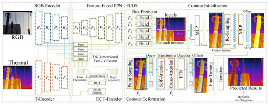 As shown in Figure 1, to address the above-mentioned problems, we develop a novel abnormal heating detection strategy for high-voltage power equipment. First, an efficient and accurate instance segmentation method is proposed to utilize the complementary information from visual and thermal images. Specifically, the tri-space feature fusion network is proposed to handle the significant modality differences from spatial, channel, and frequency domains. The thermal image is initially decomposed using discrete cosine transformation (DCT) [12] and encoded by multi-head self-attention to extract effective areas, which could provide more characteristic information. The multi-level RGB-T features are interacted with and projected along channel, spatial, and frequency dimensions to highlight foreground objects and suppress background noises. Multi-level fused features are further enhanced by the feature pyramid network (FPN) [13] and utilized for a fully convolutional one-stage (FCOS) detector. Meanwhile, the query-based contour deformation method is proposed to refine mask contours. Contour points are initially evolved via correlation with other contour points and are further refined by long-range dependence with all local points. Thus, in this way, the contour points can move towards the true contours in an iterative manner, which can effectively handle the inherent blurred details in infrared images. Compared with previous contour-based instance segmentation methods, the proposed method could achieve more robust performance against environmental interference.