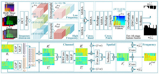 In practice, since a variety of power equipment and complicated backgrounds may exist in thermal images, the frequency information calculated by DCT may not handle varying scenes well. Thus, the DCT features are enhanced via learned strategies. High-frequency information in an image refers to details, edges, and textures, while low-frequency information refers to more gradual variations and broad patterns across larger areas of the image. Thus, is first downsampled and partitioned for RGB dimensions into low-frequency signals and high-frequency signals . Two multi-head self-attention (MHSA) modules [48] are adopted to enhance and among corresponding frequency bands. The MHSA module is further applied to the concatenation of enhanced and , which could further explore relations within different frequency bands to obtain frequency features . The DCT and the above-mentioned enhancement operations mainly describe the relations of the inner patches. Thus, the is further transposed and fed into MHSA layers to obtain cross-patch information .