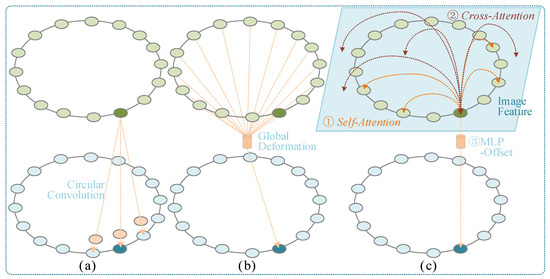 Comparison of different contour deformation strategies. (a) Circular convolution [27]; (b) global deformation via MLP layers [29]; (c) query-based contour deformation. Green points denote the features of contour points and the blue points denote the evolved results.