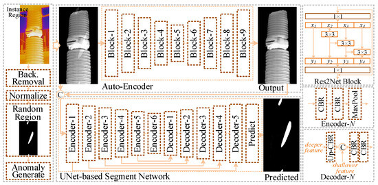 Auto-encoder-based methods generally segment abnormal areas by thresholding the reconstruction error. However, directly segmented results have low contrast due to reconstruction noise and poor threshold decisions. Therefore, we build a simple segmentation network based on the UNet framework. Encoder and decoder blocks mainly consist of convolution, batch normalization, and ReLU operations, while the max-pooling is adopted for downsampling and bilinear interpolation is adopted for upsampling. The original and the reconstructed images are concatenated into two channels as the input tensor. Then, the UNet network is used to encode the two-channel input, capturing the error area within the reconstruction process and generating accurate abnormal probability maps.