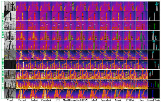 Instance segmentation results of the proposed method and state-of-the-art methods for 220 kV power equipment in challenging foggy weather or nighttime low illumination scenes.