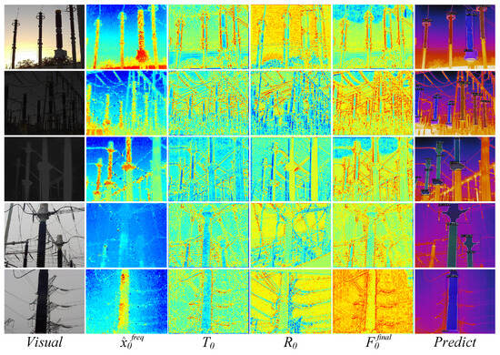 As shown in Figure 8, the imaging quality of thermal and visual images suffers from extreme weather, low illumination, and temperature changes. Infrared images could handle the changes in illumination, but the temperature distribution between the power equipment and the environment changes at nighttime. Most thermal-based methods still have good visual segmentation performance at nighttime, despite a certain degree of decrease in segmentation accuracy. The proposed method could adaptively extract sufficient characteristic information from multi-modal images and handle the influence of low-quality visual images, thus segmenting power equipment accurately. Meanwhile, the performance of compared methods decreases a lot when applied on low-contrast thermal images acquired on foggy days. The segmentation of power equipment becomes incomplete with compared methods due to unclear boundaries. Changes in temperature distribution lead to a significant decrease in the prediction confidence. Unlike these compared methods, due to the introduction of proposed modules, the proposed method could satisfy various feature fusion requirements and achieve robust performance under extreme environments.