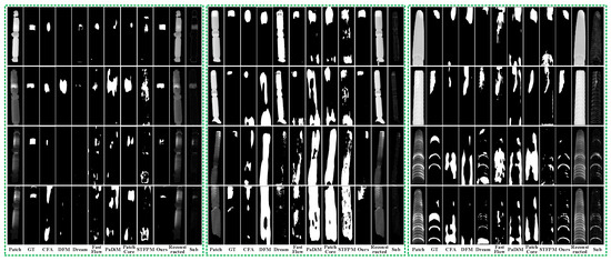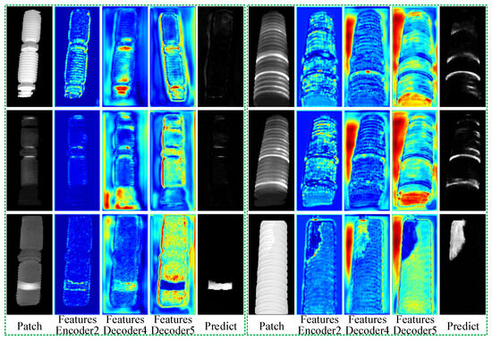 The feature maps within the UNet-like discrimination network are shown in Figure 12. By jointly encoding both original and reconstructed patches, the boundaries of abnormal areas exhibit higher responses, as clearly seen from encoded features. Differences between input and reconstructed images, including detailed textures, abnormal areas, and incomplete equipment areas, are all well captured. During the decoding process, the entire abnormal areas become more salient compared to normal areas, resulting in finer segmentation and making the proposed method more competitive.