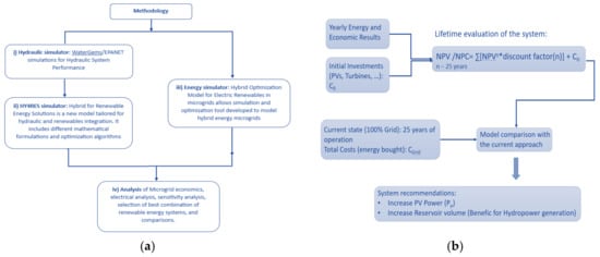 For both models, some auxiliary tools are required for hydraulic simulators for hydro and pump systems, as presented in Figure 1a. In Figure 1b a brief scheme of the economic analysis is provided.