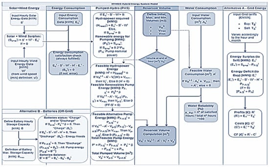 The methodology used to develop this research study is based on HY4RES (Hybrid for Renewable Energy Solutions), a newly developed model built to create a tailored hybrid energy system that better suits the water sector and process industry applications. It is versatile in terms of objective functions, hydraulic circuit characterization, economic performance indicators, CO2 emissions, hydro production and pump energy consumption, and grid or battery support. HOMER (Hybrid Optimization Model for Electric Renewables) is a simulation and optimization tool developed to model hybrid energy microgrids. It contains a highly developed economic model, taking into account factors such as capital costs, operation and maintenance, and component replacement. HY4RES is not specifically for electric components, as HOMER better covers these components, but more specifically covers the hydraulic and mechanical components’ integrated behavior.