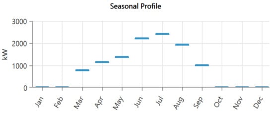 Regarding the economic analysis, the acquisition price used was 425 EUR/kW, totaling EUR 3,825,000 (considering a 50% reduction due to government benefits). The yearly operation and maintenance costs are estimated to be 1% of the initial investment, amounting to EUR 76,500 []. In HOMER, the solar irradiation data were obtained from the NASA Power database built on the defined project location, where the annual average daily radiation is 4.85 kWh/m2/day. Figure 4 shows the distribution of the solar data across different months. The peak daily radiation occurs in July, with 7.76 kWh/m2/day, while the lowest daily radiation is in December, with 2.14 kWh/m2/day. According to these values, it can be concluded that the defined project’s location (in Alentejo, in the South of Portugal), receives a substantial amount of solar irradiation throughout the year, enabling a large energy production from PV solar panels.