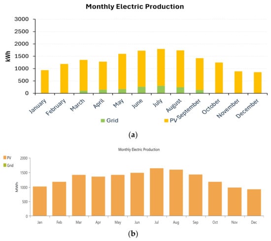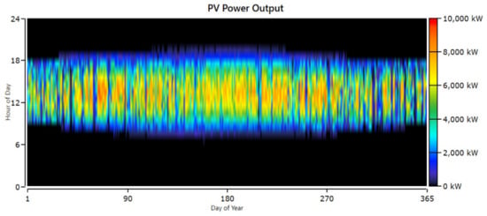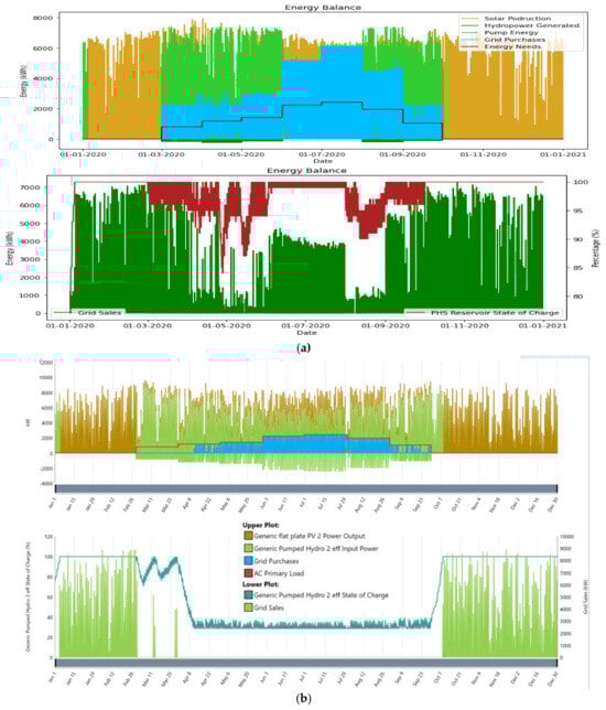 The HY4RES model easily defines the desired power to be installed that is suited to the hydraulic system components and different configurations, such as irrigation, drinking, and process industries with water allocation, pump, and hydropower stations, combined with other renewables, complemented with grid or batteries or nothing. The HOMER model presents modular pre-defined elements that need to use multipliers to obtain the desired power installed. In this case, a generic PV component of 1 kW was chosen to simulate this installation with several components that were then increased to 9000 to achieve 9 MW of capacity. Additionally, the slope was set to 33 degrees and the derating factor to 86%, to replicate the solar system used in the HY4RES model. This derating factor is a scaling factor applied to the PV array power output to account for reduced output in practical operating conditions.