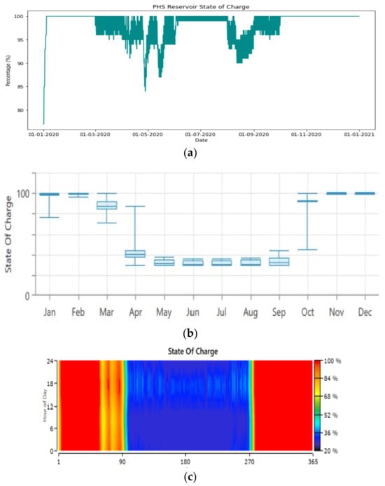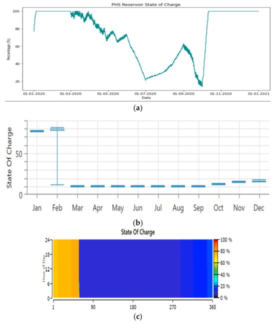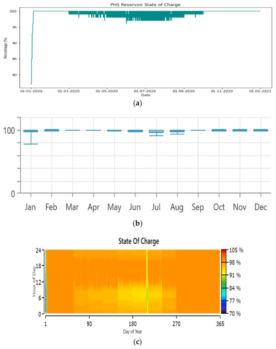 Then, in the HOMER model, it was imposed that the minimum value of the reservoir is 10.96% of its total capacity. This value attends to avoid problems with the turbine and pump system. The initial state of charge of the reservoir at the beginning of the year is set to be 76%, after the simulation of the upper reservoir volume variation based on the HY4RES model.
