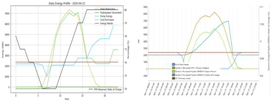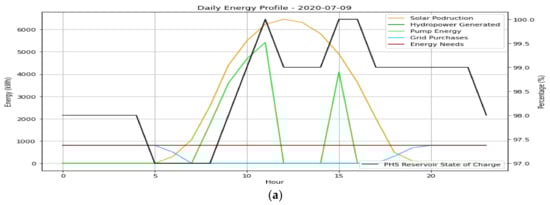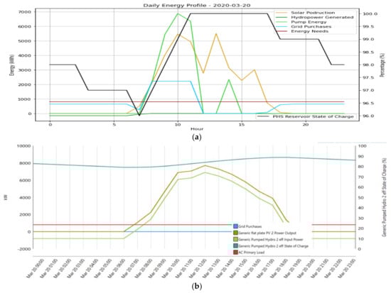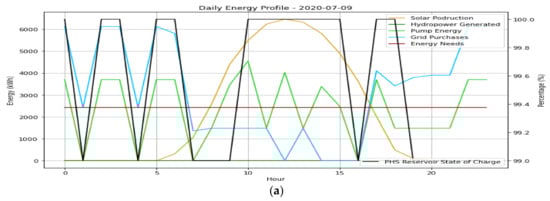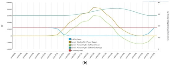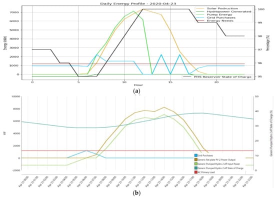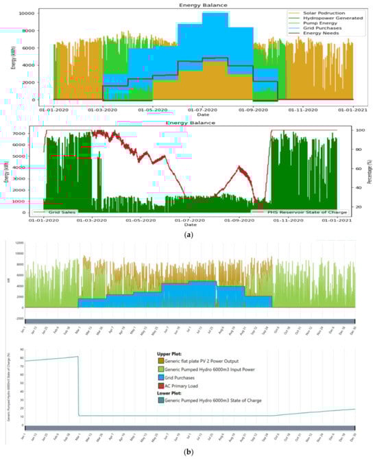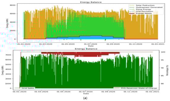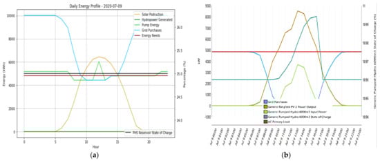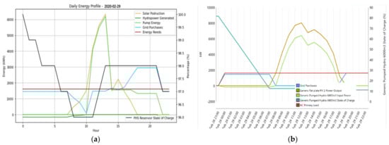 HY4RES privileges the pump and hydropower operation, water needs, and the storage of water volume in the top reservoir, which affords the potential for water allocation that HOMER is not able to suit. Hence, HY4RES uses the following formulation: PHS operation depends on solar if it is available or not available, as expressed via Equation (2), where Hneedi is the required hydropower energy to satisfy the energy needs, in kWh, else with the energy needed ( satisfied by the solar energy, and if there exists a surplus of it, then the PHS is set for pump mode to use that same energy to pump water to the higher reservoir, expressed as Equation (3), where PSi is the available renewable energy to be used by the pumps, in kWh.