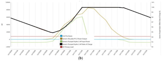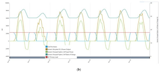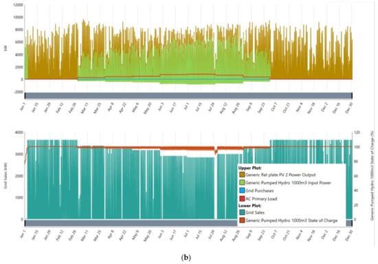 For the HOMER model, an electric converter is considered as a device that changes electrical energy from AC to DC or vice-versa depending on the type of equipment to be installed. In a system under analysis, where components work together using different forms of energy, a converter is vital for the system’s operation. It is divided into two parts: a rectifier and an inverter. An inverter converts direct current (DC) to alternating current (AC), which is essential for connecting the PV panel and the PSH (DC) to the load or grid (AC) (see Figure 3). A rectifier converts AC to DC, which is not used in this solution, except in the critical case where the grid provides power for the PSH. On the other hand, the controller is the final piece in the design of this system in HOMER, adjusting the system’s operation to meet desired objectives by changing its priorities and the way components interact. The strategy chosen in HOMER was Load Following (LF). According to HOMER’s explanation, when excess energy is needed, grid purchases are made only to meet the primary load demand. Lower priority objectives, such as charging storage, are not supplied unless renewable energy is available. In the HY4RES model, these electric devices do not need to be defined, since this model does not consider electric components.