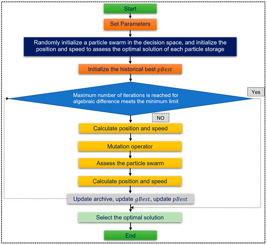 Several studies using MOPSO [85,86,87] have focused on this issue. In standard PSO, both the current global best and the individual best are used at iteration . The individual best is employed to augment the diversity in quality solutions; this diversity could be simulated using randomness. Thus, the individual best must be used in cases where the optimization problem is highly nonlinear and multimodal. In comparison to PSO, once MOPSO selects the pBest, the latter randomly selects one of them as the historical best when there is no condition for making a strict comparison to determine which one is best. To choose the , MOPSO selects a leader in the optimal set based on the degree of congestion. To select a leader and update the archive, MOPSO employs an adaptive grid method [78]. Figure 2 shows an implementation flowchart of MOPSO.