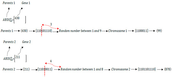 In the present study, three distinct crossover operators were considered to mate the chromosomal pairs to prevent permutation. Figure 6 illustrates these processes in a graphical manner, where the chromosome pairs were randomly selected with equal probability.