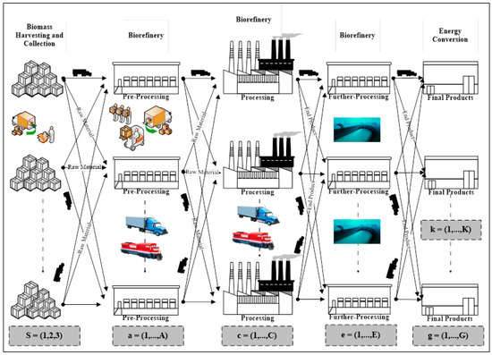 Sustainable BSC is another important area where economic, environmental, and social objectives must be considered simultaneously. The economic aspect involves the maximization of profits using biofuel SCs. GHG emissions resulting from the delivery of raw materials from supply sources, pretreatment facilities, bio-refinery plants, and demand zones are the topics of environmental sustainability. From a social perspective, sustainability means maximizing social benefits through a specified investment threshold. Previous studies often focused on generating either biomass or biofuel separately. The aim of environmental optimization is to minimize three variables: (1) GHG emission volumes [11], (2) environmental footprints [12,13], and (3) overall environmental factors based on the lifecycle assessment approach [14]. Only a few studies have integrated social criteria for optimizing biofuel and bioenergy SCs. The locations of biofuel and bioenergy plants that consume residual biomass are often in remote areas; thus, building such plants can motivate community development by creating many new jobs [15]. Therefore, labor force employment can have a significant social impact on novel biofuel and bioenergy projects [10].