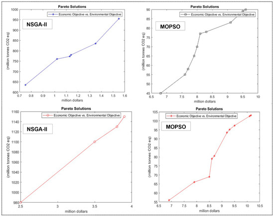 - This work proposes and uses the NSGA-II and MOPSO metaheuristics approaches for the first time to maximize the environmental and economic objectives.