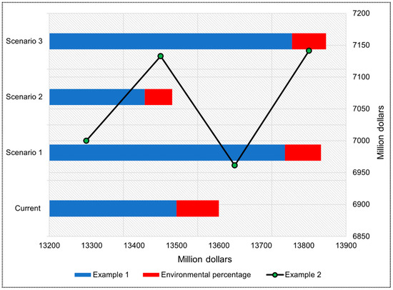 Economic, environmental, and social performance is considered when developing the mathematical model of the ideal BSC. The profit realized from product sales is less than the total cost. Therefore, as seen below, the objective function of the optimization model aims to minimize environmental emissions while maximizing overall profit using Equation (1), which is equal to the (income − costs).