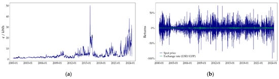 (a) Average daily spot price. (b) Comparison between the volatility of the exchange rate (USD/COP) and the spot price.