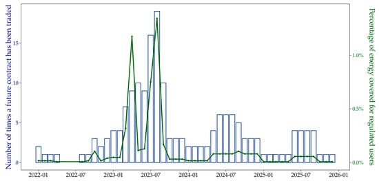 Nevertheless, this market is characterized by its illiquidity and the lack of participation of agents in both the electricity and financial sectors. Figure 3 shows the number of times a contract has been traded (left axis) and the percentage of energy covered (right axis), with the maturity indicated on the horizontal axis. For instance, the height of the bar on July 2024 on the left axis indicates that a futures contract has been traded six times and expires in July 2024. This contract covers less than 0.5% of the energy for regulated users, as shown on the right axis. A low volume of transactions and low energy coverage are observed, making it difficult to develop this market.