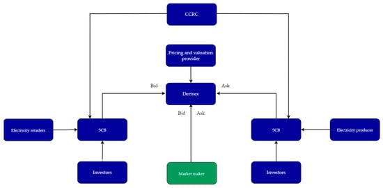 To overcome these inefficiencies, this article proposes a new agent that fulfills the role of the market maker. This new agent serves as a facilitator in managing the risks of the retailers’ energy purchasing portfolio, thereby transferring efficient costs of the tariff to the end-user. And, though the electricity market requires a series of adjustments that have been addressed in other studies [], this article analyzes the functions and the impact of a market maker, as these aspects have not been studied in depth in previous works, to the best of our knowledge. While the impact of market makers is widely known in developed financial and energy markets, this proposal focuses on an electricity market that has not yet reached an important level of maturity in terms of the number of participants (energy supply) or active demand participation.