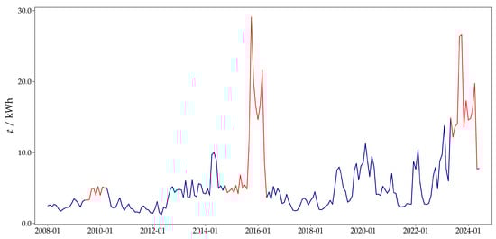 The numerical analysis of this subsection is constructed with multiple scenarios using the Bootstrap method, which is widely used in the literature for non-parametric studies. This is because there is little data to determine a distribution for the spot market price or for the futures price in Colombia. Figure 6 shows the average monthly prices observed in the spot market from January 2008 to June 2024, where prices during the El Niño phenomenon are highlighted in red. This phenomenon, characterized by low hydrology conditions, leads to price increases due to reduced hydropower supply (approximately 60% of the energy supply is hydro-dependent).