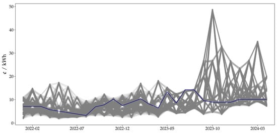 Figure 8 presents the results of 10,000 simulations of possible scenarios of average monthly spot prices resulting from sampling the values in Figure 7. Each possible scenario—a gray line—is constructed by sampling a January value from the top left box of Figure 7 adjusted to January 2022 using the Producer Price Index (PPI). Then, the February value is sampled and adjusted with its February 2022 PPI value, and so on, until the construction of a possible scenario within the window between January 2022 and January 2024 is complete. This window is selected because, from January 2022, it is possible to transfer purchases made through futures to regulated users, and the Colombian energy derivatives trading platform publishes futures price information from that period. The blue line in Figure 8 represents the realization of futures prices between 2022 and 2024.