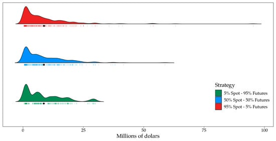 The cost transferred to regulated users through these strategies is calculated with component G, detailed in Section 3.1, specifically through expressions (2c) and (2d). Figure 9 shows the density plots of the three employed strategies. In an extreme scenario, a 95% exposure to the spot market leads to users bearing a cost of nearly one hundred million dollars (the point on the far right). Cost dispersion decreases as coverage through futures increases. This dispersion represents the market risk assumed by regulated users, and according to the results, it is mitigated with the hedges that need to be promoted through a liquid futures market, which must be promoted by the market maker proposed in the article.