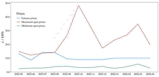 Finally, a stress test demonstrates the benefit in terms of economic savings under extreme conditions. This test is constructed with the observed maximum and minimum spot prices; the highest and lowest spot prices from Figure 6 are taken and compared with the observed futures prices. This is shown in Figure 10, where it is noted that futures are a better alternative since, in the analyzed time window, they present a smaller difference with minimum values than with maximum values.