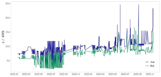 The impact of the market maker can be approached from different perspectives. This subsection considers a retrospective analysis to establish the coverage effect of regulated demand—the majority of consumers in the country—that a market maker would have. Figure 11 shows the spread from January 2022 to November 2023, with the best bid and ask prices registered on Derivex that did not manage to close. This corresponds to the closest spreads obtained on those trading days without closing. Note that in Figure 11, on a significant number of days, futures contracts did not close. This demonstrates the lack of liquidity currently affecting this derivative, backing the need for a market maker. In fact, of the 626 trading days that correspond to the observation window, 64.22% did not manage to close.