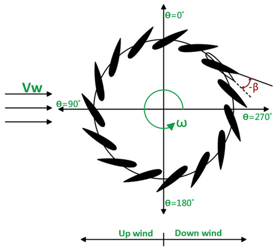 Schematic representation of blade pitch for H-type Darrieus VAWT.