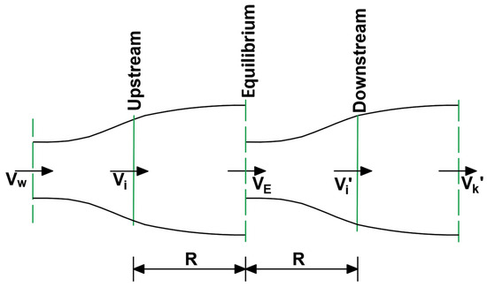 The air velocity at the downstream equilibrium (VE) can be found using Equations (A1) and (A2):