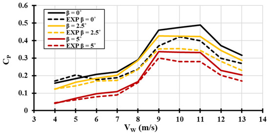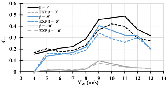 Validation of DMST model (VW−CP) curve at different negative pitch angles (β).