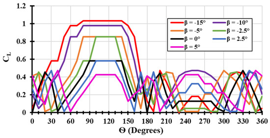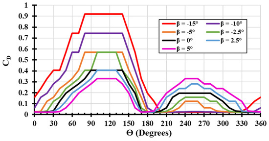 The change in the AOA will result in changes in the lift coefficient and drag coefficient, as presented in Figure 9 and Figure 10, respectively. The highest coefficient of lift and drag are obtained at a pitch angle of (β = −15°) in the azimuth positions between 60° and 150°; the angle of attack is almost in the range between () and (). At high angles of attack, the separated flow creates vortices that increase the lift forces, but at the same time, significantly increase the drag forces [37]. Additionally, AOA creates a considerable pressure difference across the blade, resulting in a higher lift force; however, the effectiveness of the lift force is reduced because of the separated flow, while the drag force increases [38]. At large angles of attack, a larger area of the blade surface is exposed to the airflow, which increases both the lift and drag [39].
