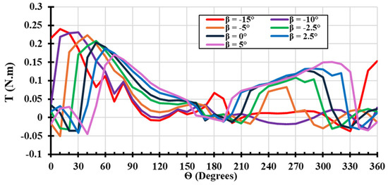 Fixed blade pitching can increase the value of the torque peak during operation; however, this could reduce the torque generated at other azimuth positions, as illustrated in Figure 11. For instance, at a pitch angle of (), the value of the torque reaches the peak at the range between () and () azimuth positions; then the torque reduces towards 180°. This occurs as a result of an aerodynamic stall due to the high angle of attack reached after the azimuth position of (). In the downstream part of the rotor, the torque generated at () was much less than the torque generated at (). The torque (T) against the Azimuth angle () graph in Figure 11 shows the individual contributions of each blade to the total torque of the H-type Darrieus VAWT at different pitch angles.