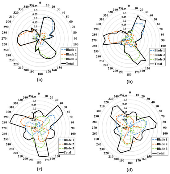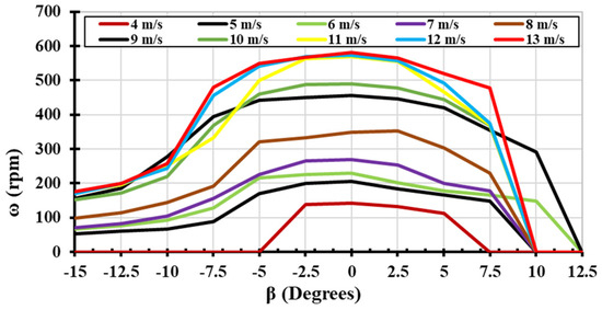 From Figure 12, it is obvious that any increase or decrease in the fixed blade pitch angle value between () and () will reduce the power coefficient of the wind turbine. The highest power coefficient occurs at a pitch angle equal to zero (). The higher the pitch angle, either positive or negative, the less power is obtained. Even a small pitch angle which can delay the stall will have a negative effect on the rotor in the downstream region, as shown in Figure 11. Furthermore, the higher the pitch angle towards (), the higher the torque peak; however, this increase in the torque will be followed by a stall, creating a heavy drag force on the wind turbine blade. This will eventually affect the total amount of torque generated by the blades, leading to less rotational speed. The effect of the blade pitch angle on the torque generated by each blade is represented as a radar graph in Figure 13. At a pitch angle of (), the highest amount of accumulating torque is generated when compared to all other pitch angles. Figure 14 presents the effect of blade pitch angle of the rotational speed at different wind speed values.