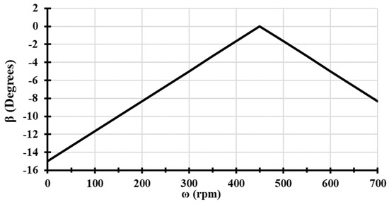 The equation considers the rotor rotational speed as the main factor. During the initial stage of turbine operation, where the rotational speed (), the pitch angle will be at the maximum. As demonstrated in Section 4.3, the higher the negative pitch angle towards (), the better the self-start ability of the turbine. As the wind turbine reaches the ideal rotational speed for a specific wind speed value, the pitch angle is reduced towards a zero pitch (). As mentioned in Section 4.2, the highest rotational speed value is achieved at a zero pitch angle. In the case of overspeed, the wind turbine blades will be pitched to a negative value as well to reduce the rotational speed by increasing the drag force acting on the blade. Similar to the starting stage, the blade pitch angle value will increase as the rotor reaches a higher excessive rotational speed. Figure 15 represents an example of the change in the pitch angle () as the wind turbine’s rotational speed increases for a selected wind speed of (), with an ideal rotational speed which is set to (). The developed technique is less complicated on the aerodynamic side and is mechanically feasible to be implemented at a relatively lower cost compared to other VP techniques.