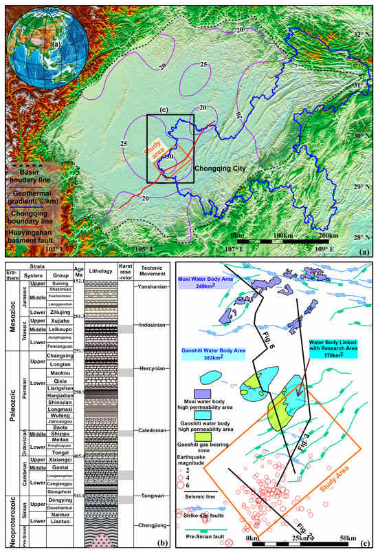 (a) Regional location map of the Sichuan Basin, with the study area delineated by the orange box. Figure 1a marked on the global elevation map with a red box. (b) General stratigraphic column and tectonic movements within the Sichuan Basin, with karst reservoirs highlighted in a shallow grey box. (c) Figure 1c displays the water body area surrounding the study site, along with the distribution of seismic events and basement faults.