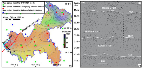 (a) The depth map of the Moho Surface in the Chongqing region and the deep reflection profile of the study area (b).