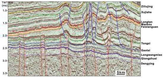 Recent advanced 3D seismic explorations have detected multiple active strike-slip faults that extend from the Sinian and Cambrian up to the Permian [54]. Interpreted as extensional and torsional faults from the Himalayan orogeny, they overlap with or superpose onto the upper Mesozoic faults (Figure 3). These intersecting fault structures at different depths exhibit notable permeability and serve as conduits for geothermal water flow [55], causing the emergence of varied water types in the Cambrian Longwangmiao Formation, such as NaHCO3, MgCl2, and Na2SO4. The water mineralisation levels can be as low as 0.573 g/L [48]. Additionally, the Caledonian orogeny led to the exposure of the Longwangmiao Formation along the study area’s northwest margin, enabling groundwater to infiltrate downward along fault structures, which predominantly delineate the permeable zones [56]. Water production analysis from wells in the Longwangmiao Formation demonstrates a correlation between the proximity to faults and increased water yield, with wells closer to faults producing more water in comparison to those further away [57].